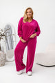 Bluza cu decolteu în V și pantalonii cu talie elastică creează un echilibru perfect între relaxare și rafinament.