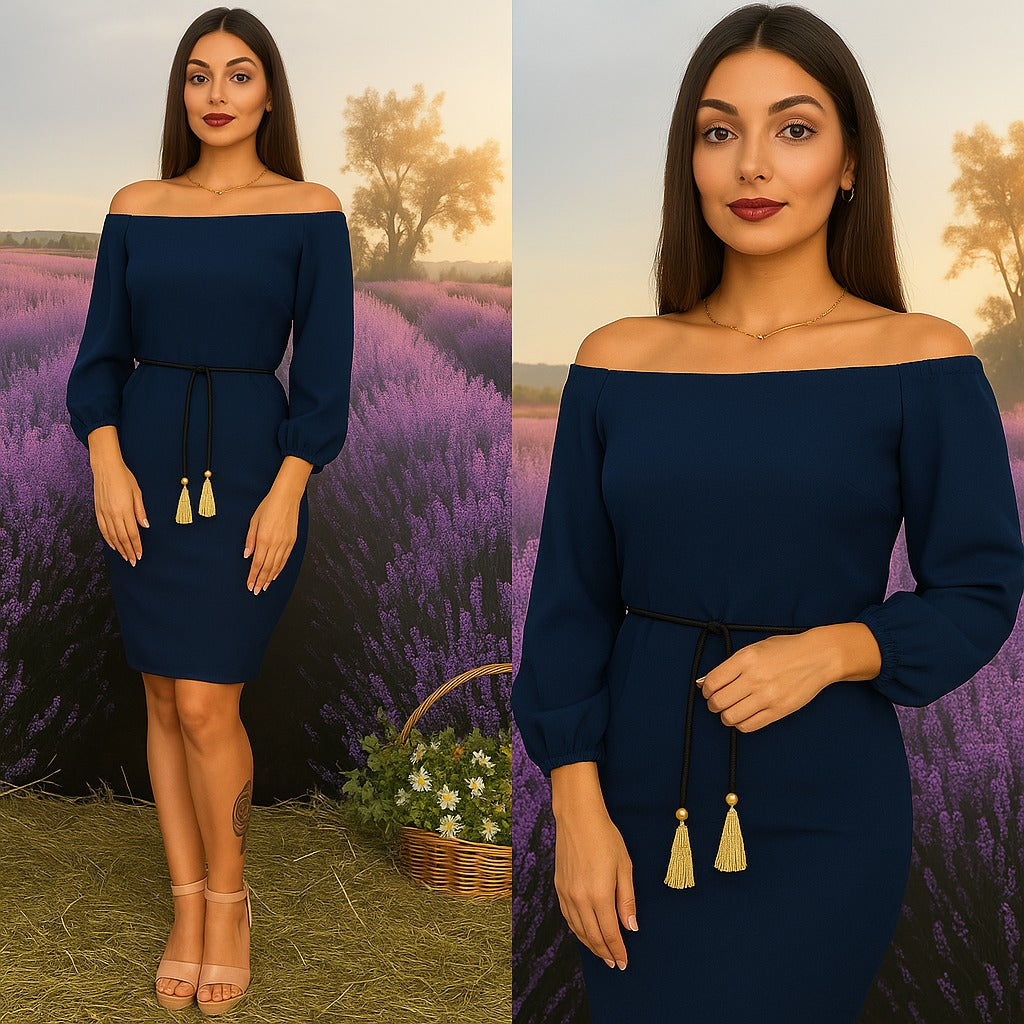 ✔ Design Elegant – Croială dreaptă, ușor cambrată, cu umerii goi și cordon reglabil în talie.