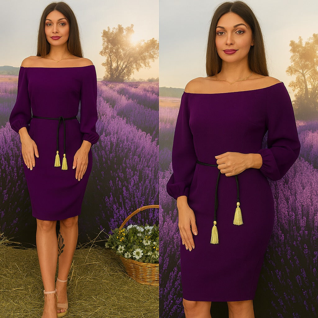 ✔ Design Elegant – Croială dreaptă, ușor cambrată, cu umerii goi și cordon reglabil în talie.