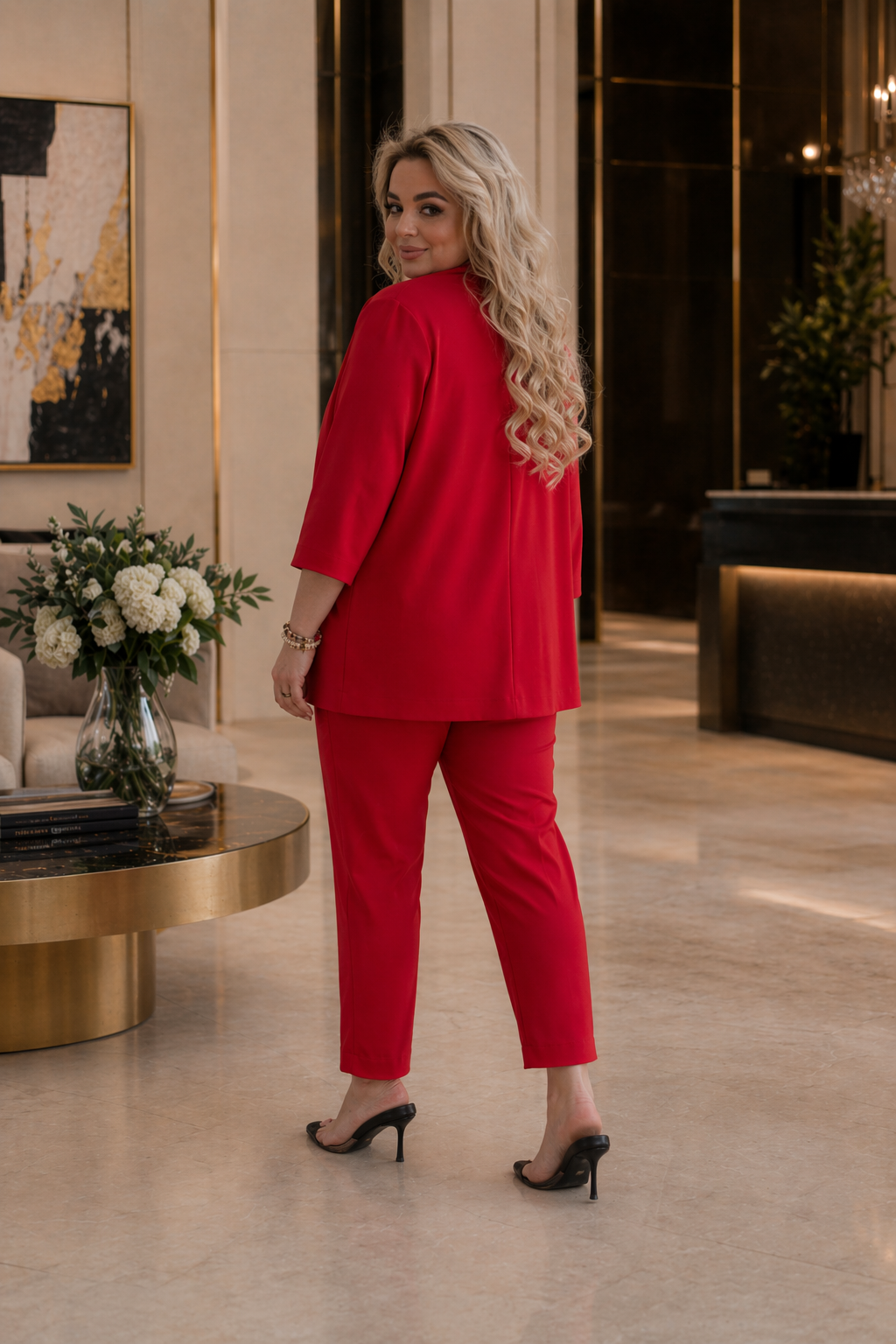 Compleul include un sacou lejer și pantaloni cu croială feminină, gândite pentru a oferi un look modern și bine conturat. Linia simplă și elegantă permite purtarea setului atât împreună, pentru un outfit complet, cât și separat, în combinații diverse și stilate.