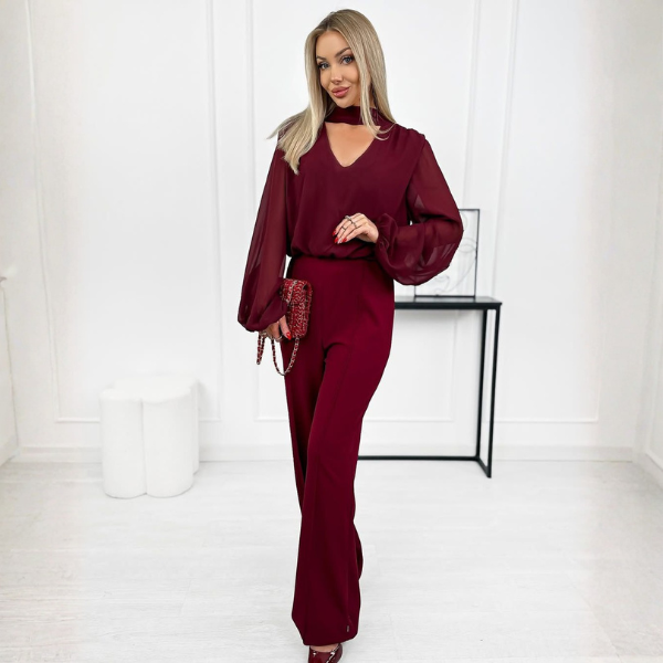 Croiala avantajează silueta, iar combinația dintre partea fluidă din voal și pantalonii lungi creează un efect sofisticat și armonios. Este o piesă ideală pentru apariții elegante, fără a renunța la confort.